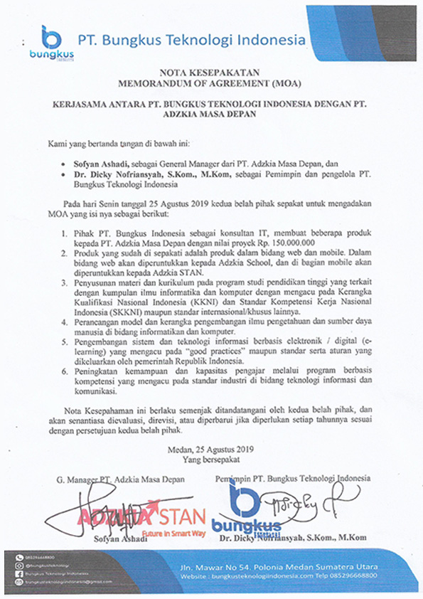 Secara yuridis kerjasama dikenal dengan istilah Nota Kesepahaman (dalam bahasa hukum disebut MoU) dan Perjanjian (dalam bahasa hukum disebut MoA). Terdapat beberapa perusahaan maupun instansi pemerintahan yang sudah menjalin kerjasama (MoU) dan sampai dalam kesepakatan (MoA) dengan PT. Bungkus Teknologi Indonesia. Setelah melakukan kesepakatan, PT. Bungkus Teknologi Indonesia menyimpan surat perjanjian tersebut menjadi arsip elektronik atau disebut juga dengan dokumen digital. Dokumen digital ini bersifat rahasia dan hanya dapat di kelola oleh Direktur dari PT. Bungkus Teknologi Indonesia. Namun dokumen digital tersebut belum disertai dengan sistem keamanan, sehingga dikhawatirkan akan terjadi manipulasi data yang dilakukan oleh orang yang tidak berwenang dan bertanggung jawab atas dokumen tersebut.Untuk membantu PT. Bungkus Teknologi Indonesia dalam mengamankann data digital MoA dapat dilakukan dengan membuat sebuah sistem security dengan algoritma RSA.Dengan berhasilnya dibangunnya sistem security untuk mengamankan data digital ini, PT. Bungkus Teknologi Indonesia sangat terbantu dalam menjaga keamanan data MoA tanpa perlu khawatir terjadinya manipulasi data oleh pihak yang tidak bertanggung jawab.Secara yuridis kerjasama dikenal dengan istilah Nota Kesepahaman (dalam bahasa hukum disebut MoU) dan Perjanjian (dalam bahasa hukum disebut MoA). Terdapat beberapa perusahaan maupun instansi pemerintahan yang sudah menjalin kerjasama (MoU) dan sampai dalam kesepakatan (MoA) dengan PT. Bungkus Teknologi Indonesia. Setelah melakukan kesepakatan, PT. Bungkus Teknologi Indonesia menyimpan surat perjanjian tersebut menjadi arsip elektronik atau disebut juga dengan dokumen digital. Dokumen digital ini bersifat rahasia dan hanya dapat di kelola oleh Direktur dari PT. Bungkus Teknologi Indonesia. Namun dokumen digital tersebut belum disertai dengan sistem keamanan, sehingga dikhawatirkan akan terjadi manipulasi data yang dilakukan oleh orang yang tidak berwenang dan bertanggung jawab atas dokumen tersebut.